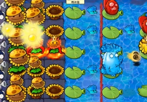 3、在红线的左侧种植多个寒冰海兵菇对敌人进行输出。