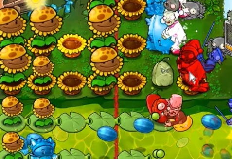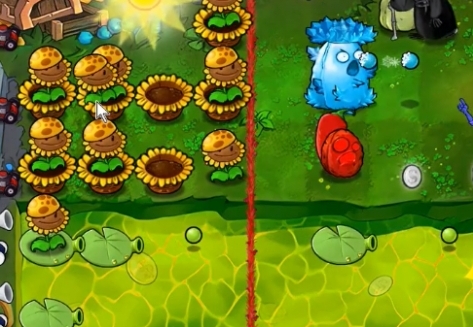 4、然后在左侧种植补充一列阳光向日葵,在水池中种植多个豌豆荷叶和寒冰西瓜猫蒲。