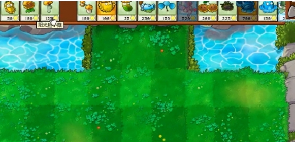 2、先在中间草坪上种植五个阳光向日葵,在左上角水池中种植一个寒冰香蒲。