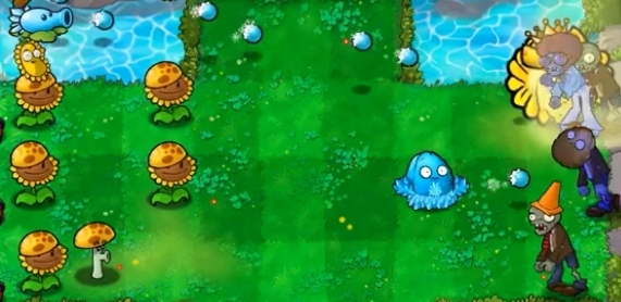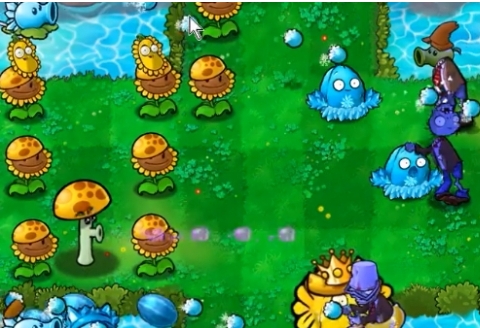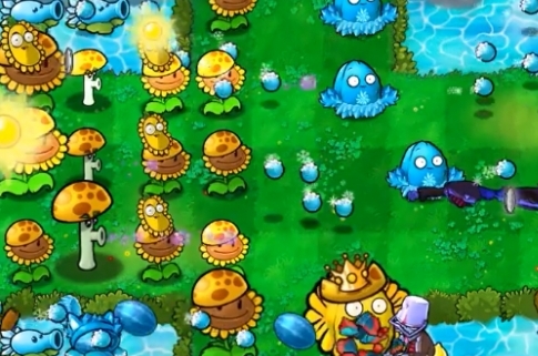 5、最后在水池中补充多个寒冰西瓜猫蒲和寒冰香蒲,在草坪上补充一列阳光菇投手就可以过关了。