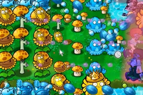 3、继续在中间草坪上补充阳光向日葵,在下方种植一个寒冰香蒲和一个寒冰西瓜猫蒲进行输出。