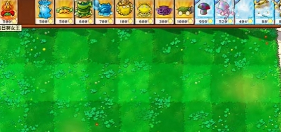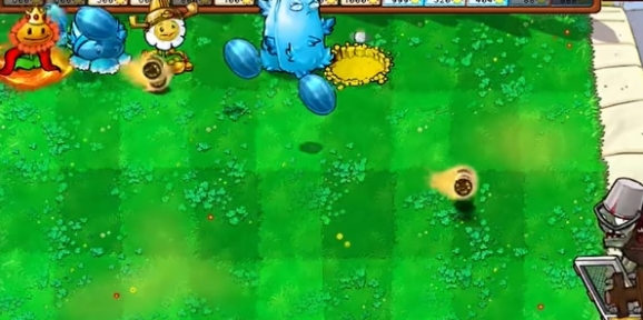 3、在二路分别种植一个向日葵女王、寒冰西瓜猫蒲和高冰果,在五路右侧种植一个豌豆汉堡。