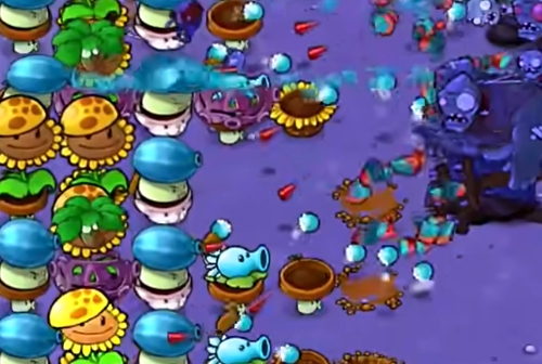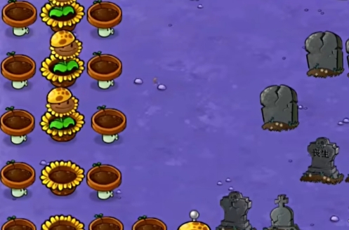 3、继续补充右侧的小盆菇和毁灭坚果,在左侧第四列补充一个寒冰豌豆香蒲。