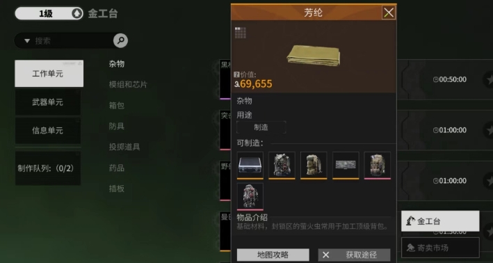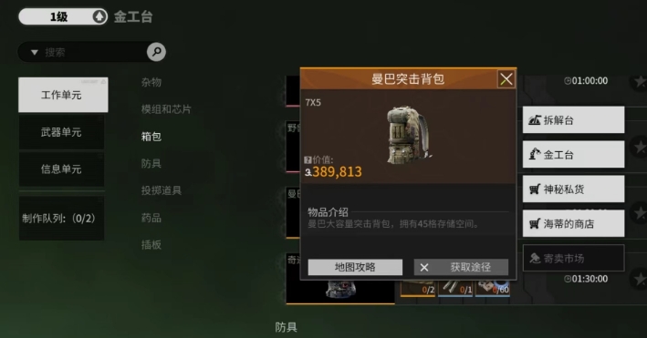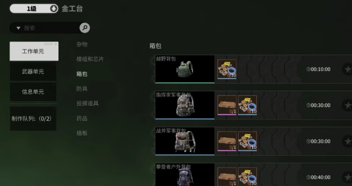 此外,在金工台中自行打造也是关键的获取方式。打开金工台,选择工作单元,其中包含多种可制作选项,箱包便是其一。点击后,能看到各个等级的箱包,从基础的越野背包,到战斧军事背包、砂岩战术背包、野兽突击背包、奇迹突击背包等,种类繁多。选择要制造的箱包类型,即可查看所需材料。