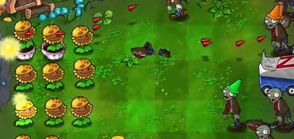 3、然后在左侧种植一列阳光向日葵,在上方种植一个猫蒲花盆。