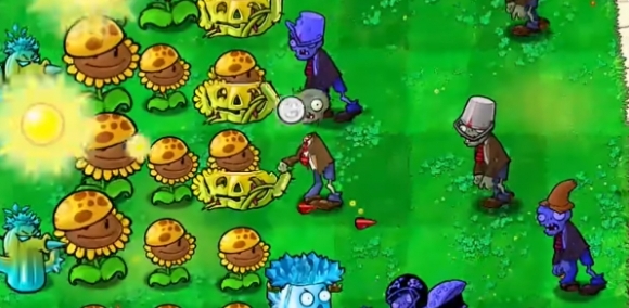 4、然后在右侧种植多个高冰果,继续补充多个阳光向日葵。