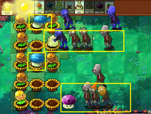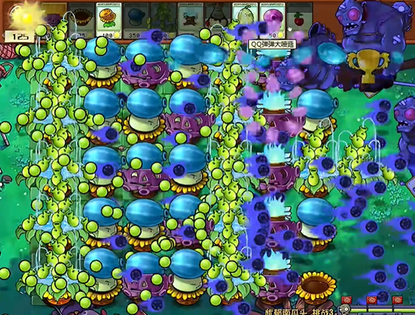 3、中期我们由里向外铺开植物,放置冰瓜大喷菇为主,豌豆许愿池和南瓜为辅。