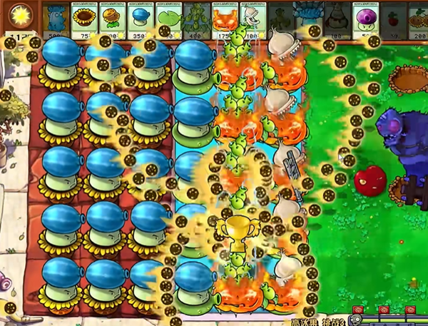 4、阳光达到5千左右的时候,我们就可以铲除向日葵,去种植更多的输出植物,这里小编种植了4列冰瓜大喷菇。