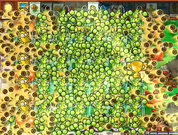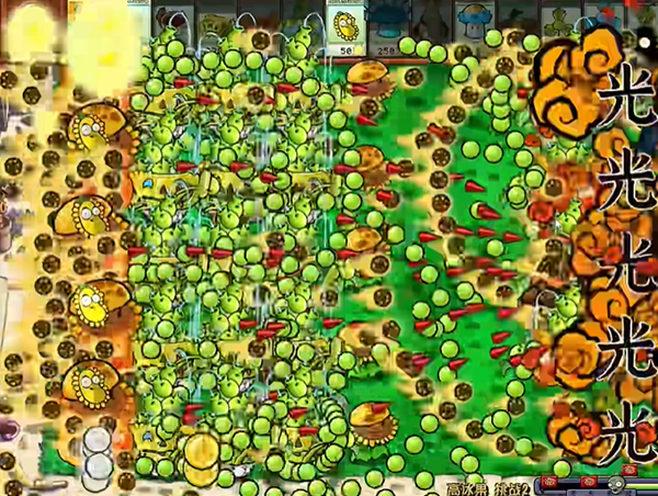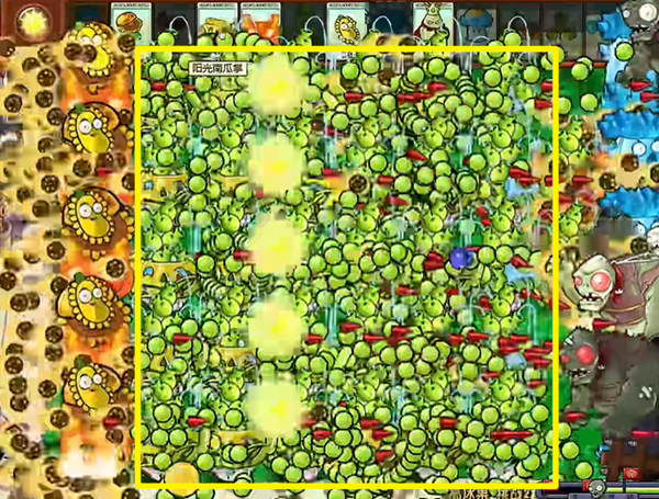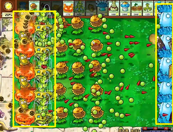 2、前面可以先用高冰果放在第一排撑着争取时间,后面就用向日葵来发育,当我们有了足够的阳光,就去种植更多的豌豆喷泉。
