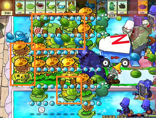 2、中期会出现很多巨人僵尸,打不过来我们就使用吹风来反制,期间不断种植上下4路的西瓜猫蒲。