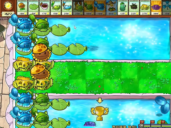 1、开局我们可以在中路尽情布置向日葵,西瓜猫蒲放置在水池里面就可以打6路敌人了。