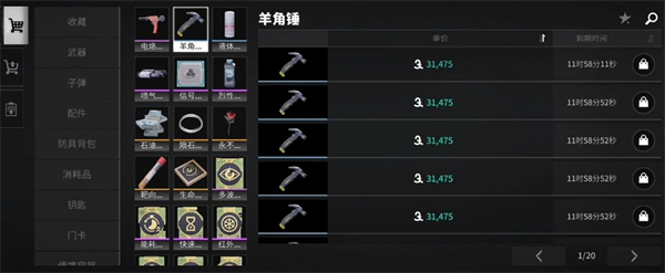 4、或者点击【寄卖市场】,即可自动跳转,可以看到市场中的羊角锤。