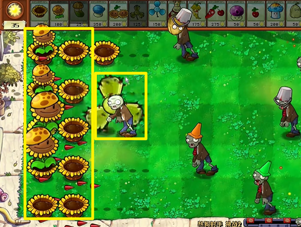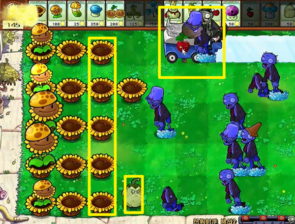 4、第二波的时候如果有了足够的阳光,我们可以把第一列的向日葵铲除,造输出植物。