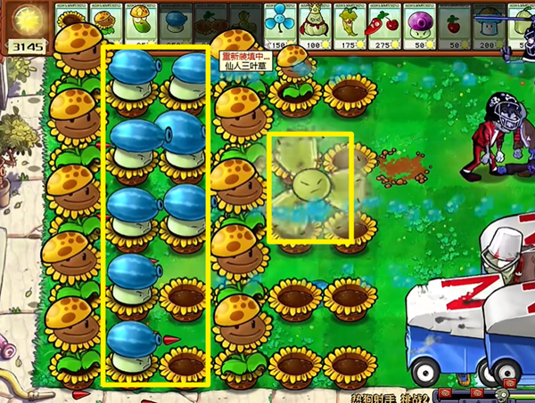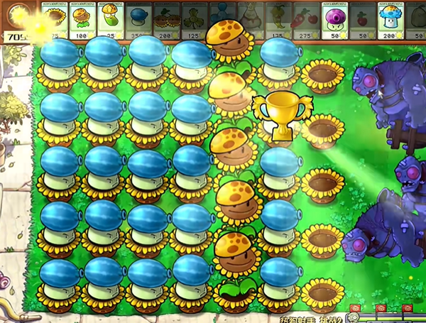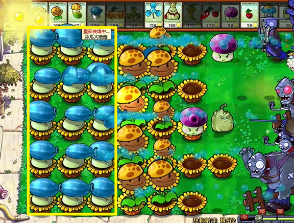 5、最终全屏都补上冰瓜大喷菇就可以了,多余的向日葵都可以铲除掉。