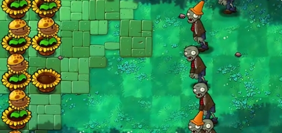 2、先在左侧种植两列向日葵花盆和阳光向日葵,在最下方一路种植一个川菜地雷。