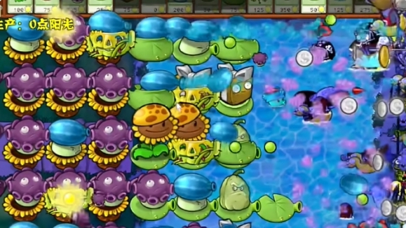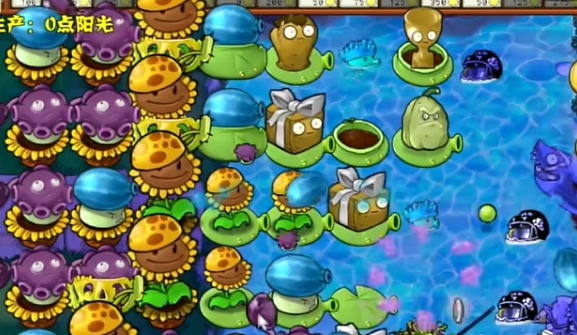 4、在水池中种植三个寒冰海兵菇,在左侧种植一个寒冰大喷菇和大喷菇投手。