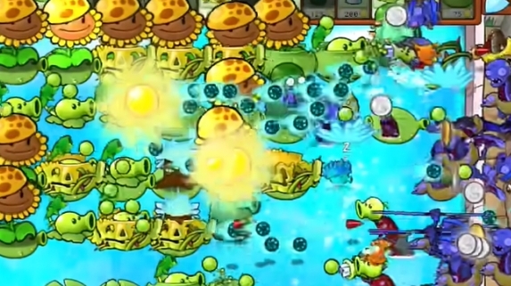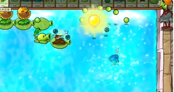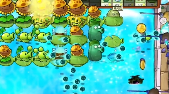 2、先在一路种植三个阳光向日葵,在二路种植一个豌豆香蒲和一个蓝火冰炬。