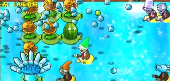 3、当下方的僵尸快靠近小推车时,种植一个寒冰豌豆菇。