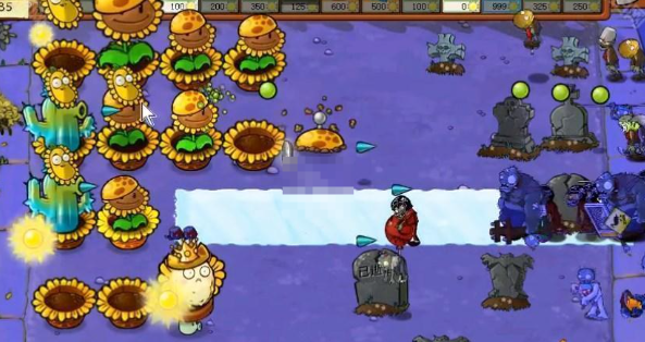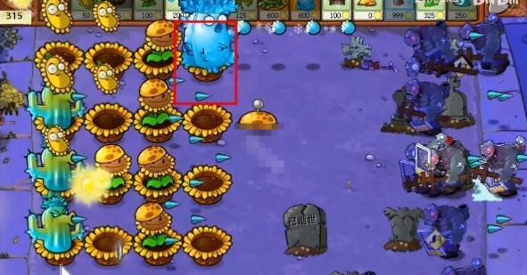 2、在最后一排可以种植寒冰仙人掌,仙人掌上面可以放阳光豆。