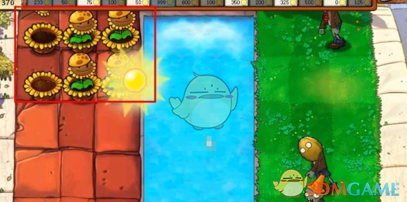 1、植物大战僵尸杂交版挑战模式第56关在砖地上面放阳光花盆,在阳光花盆里面种植阳光向日葵,快速收集能量,观察僵尸率先进攻的道路。