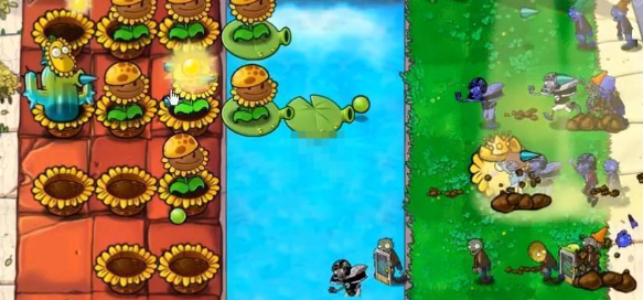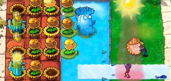 2、在水池里面种植豌豆睡莲,后排放寒冰仙人掌攻击僵尸。