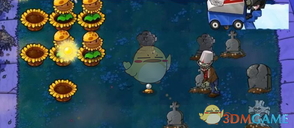 1、植物大战僵尸杂交版挑战模式第76关这一局是黑夜模式,前面有着很多的墓碑,在后面种植阳光花盆,花盆里面放向日葵,使用向日葵收集阳光。