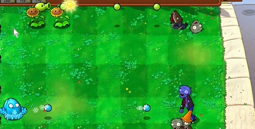 2、先在左侧上路种植两个豌豆向日葵,在左侧种植一个寒冰坚果。