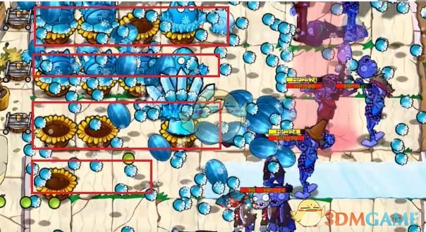 3、然后在第二行放两个阳光花盆和一个冰瓜香蒲。