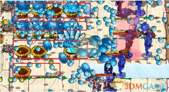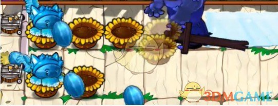 3、然后在第二行放两个阳光花盆和一个冰瓜香蒲。