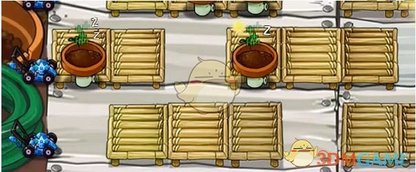 2、首先在左侧第二个位置放一个小盆菇和小猫向日葵。