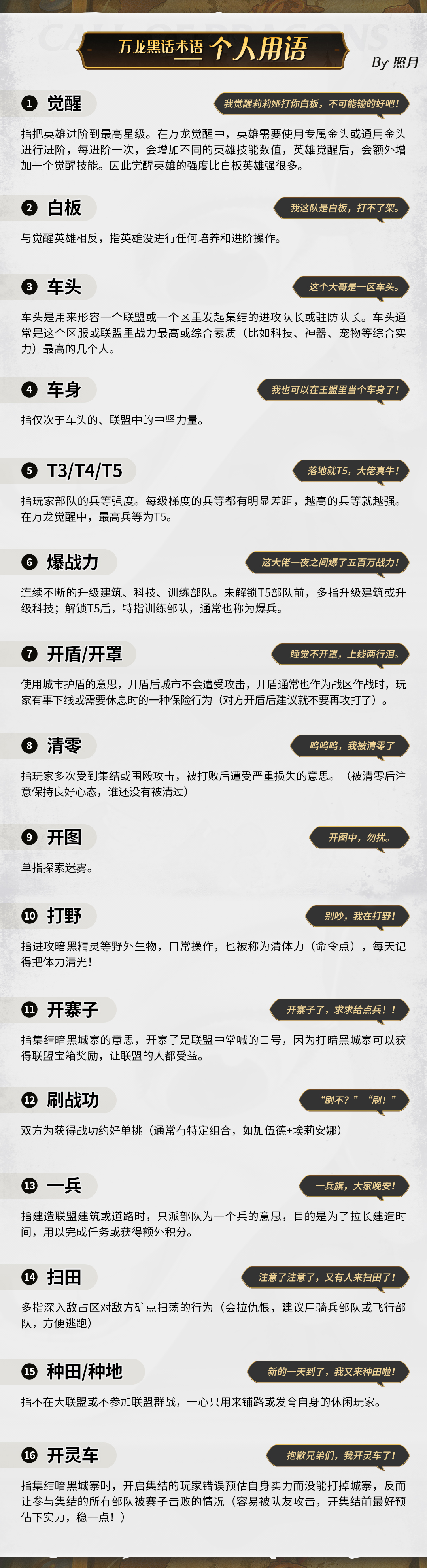 《万龙觉醒》加入经典RTS真实射程机制,真正做到在短兵相接前,远程单位就在数里之外输出。既有精灵弓箭手、人族弩车、兽族投矛手这样灵活的高输出兵种,也有修女、半羊人咒术师、长须树精这些射程更长的法术单位。下面是小编给大家带来的《万龙觉醒》万龙黑话术语大全,感兴趣的小伙伴们一起来看看吧。