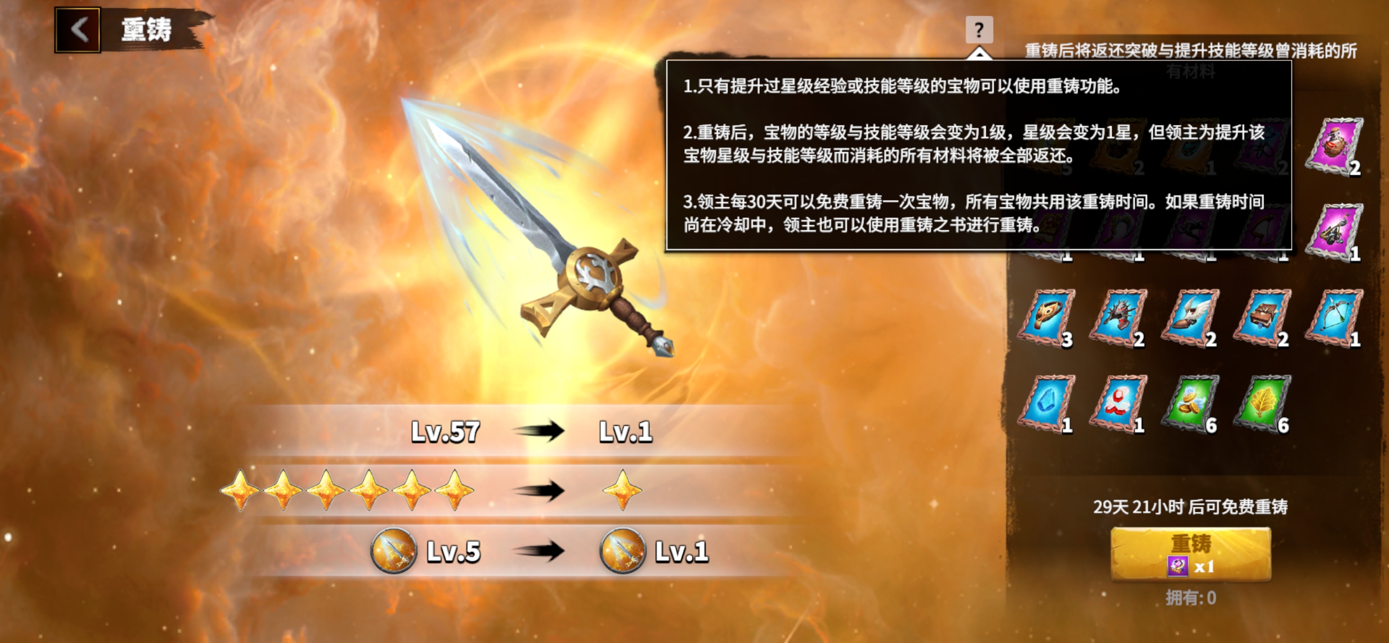 重铸后宝物的等级、星级和技能等级都会变成1,但会返还突破星级和技能升级时消耗的所有秘符(提升宝物等级时消耗的魔法尘埃无法返还)。