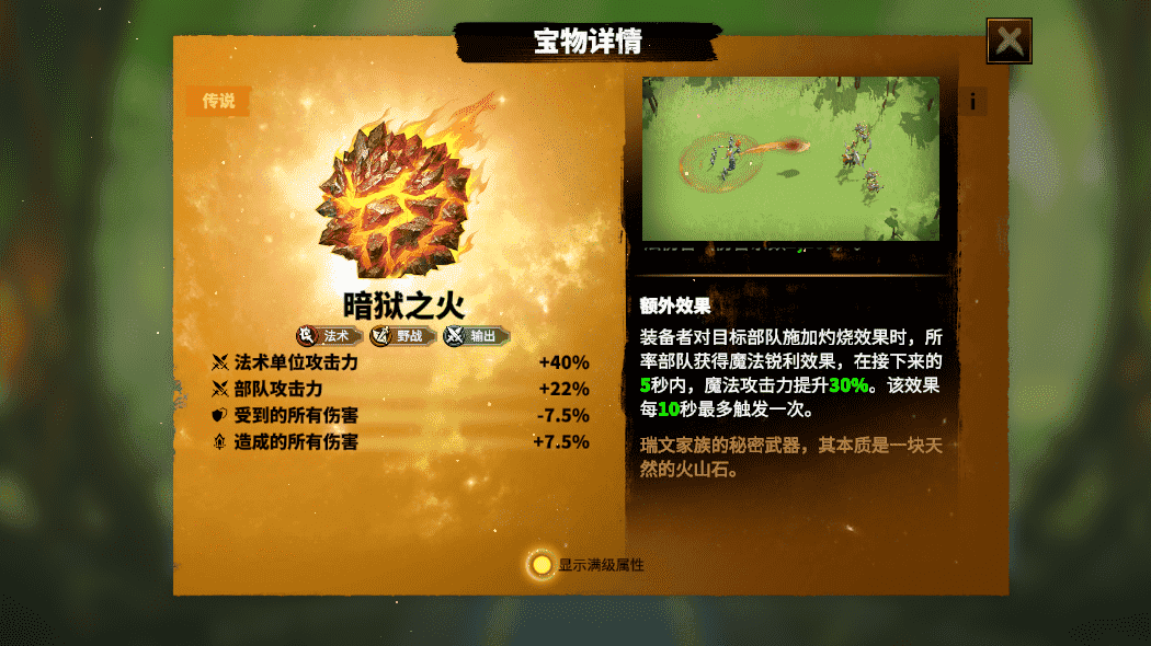 宝物技能——炎爆术,为远距离高系数范围伤害,能够对敌方聚集部队造成大量杀伤。