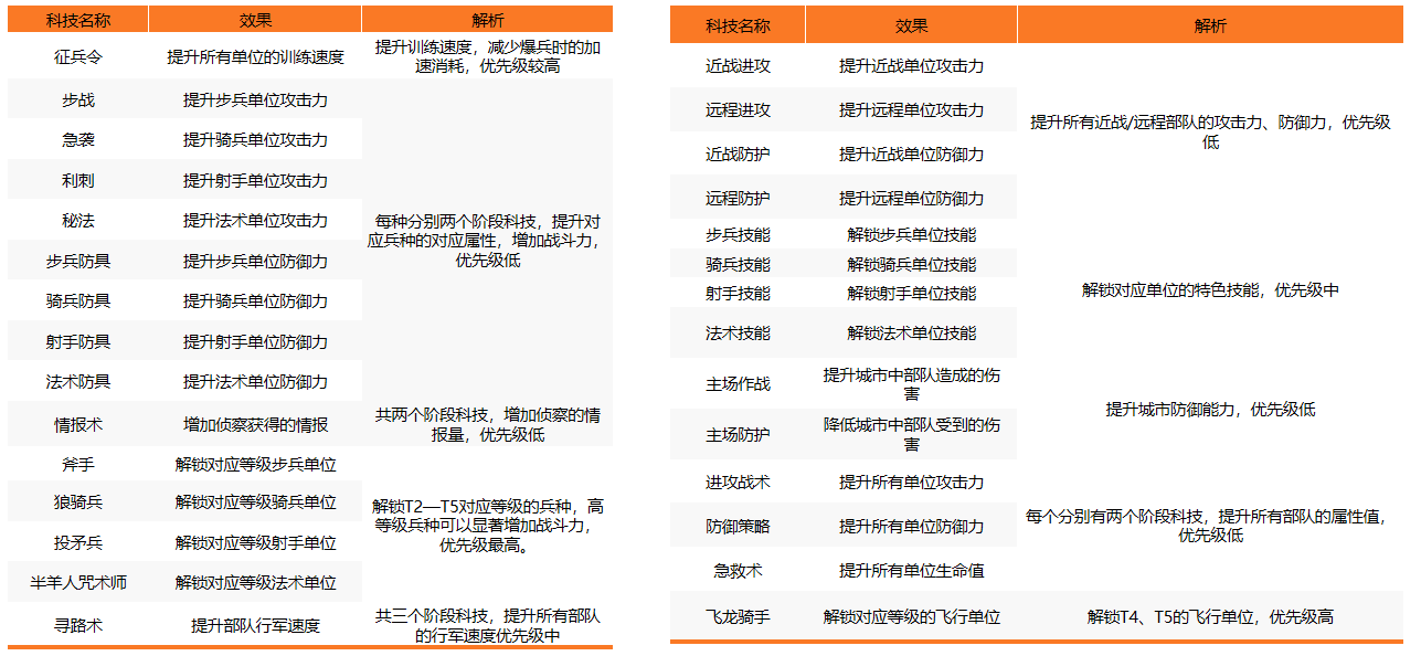 军事科技主要提供新兵种解锁、作战加成以及行军速度加成等内容,是提升部队战斗力的主要手段。(以下科技以荒野聚落举例)