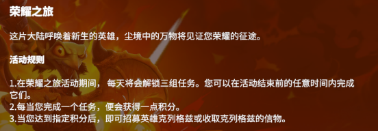 荣耀之旅是一个从账号创建开始持续七日的新手活动,参与该活动可以获得大量的钥匙、加速道具以及飞行英雄克列格兹本体及60个克列格兹信物。