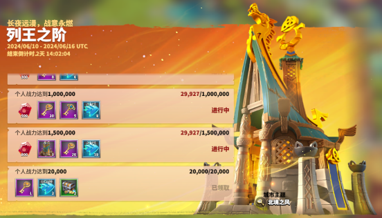 列王之阶是一个持续持续七天的战力冲刺活动,在七天之内每达到一个战力目标,就可以获取宝石、钥匙、加速、资源等奖励。