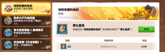 这个活动本质上是一个打野活动,在我们击败地图上的黑暗精灵之后,我们就会收到这样一个名为“埃莉安娜的危机”的邮件,可以在该邮件中领取活动道具祭礼面具。