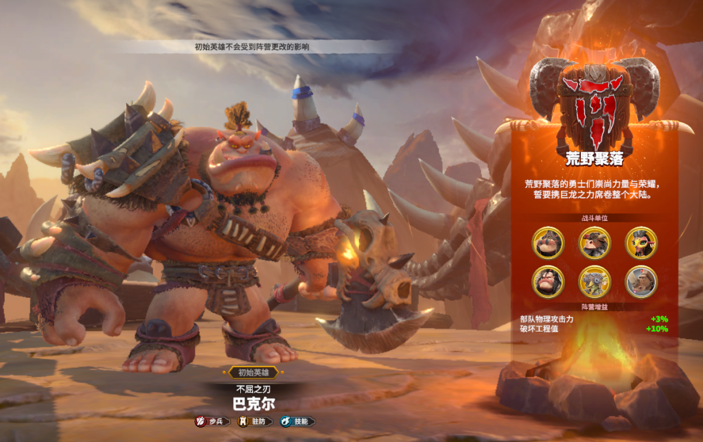 也叫“兽人”,选择荒野聚落可以获得初始英雄巴克尔,完成主线任务也可以获得大量巴克尔信物,帮助我们快速觉醒。巴克尔是一个在第一赛季很强力的步兵英雄,并且是万龙觉醒中少有的驻防统帅。