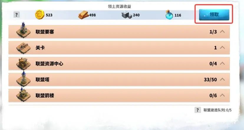 领土界面可以看到联盟当前的建造情况,还可以领取各类资源,当联盟建造建筑时请与其他成员一起,帮助联盟快快发展吧;