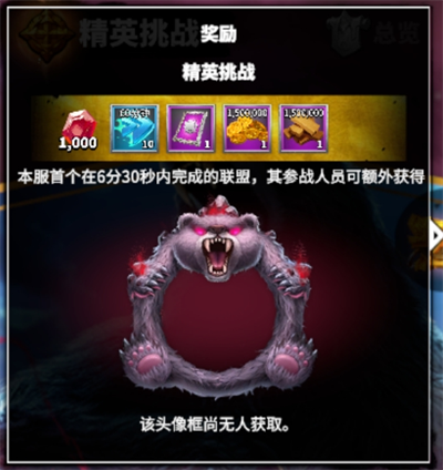 完成精英挑战后,所有联盟成员获得大量道具奖励,获得首杀的联盟参展成员更可以额外获得该魔兽主题的头像框!