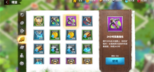 采集强化道具拥有对所有部队,除宝石外所有种类资源采集速度+50%的巨额增幅,对采集效率的提升极大(尤其是前期),因此采集时一定要启用这个道具。