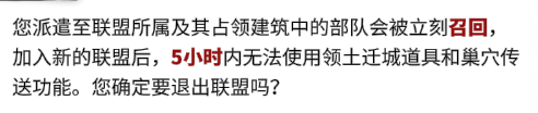需要注意的是,如果退出联盟后加入新的联盟,一定时间内将无法使用领土迁城道具来转移自己的城堡,该时间会随着大厅等级提高而提高,最高为24小时。