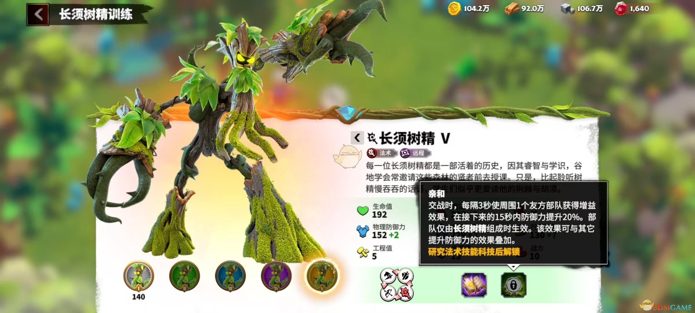 一、当玩家选择了圣泉之翎阵营之后,就可以在基地中建造常青树屋,然后批量制作长须树精。兵种等级从一级开始,一直到最高的五级,属性方面逐渐提升,但是外形和基本效果都是一样的。长须树精是属于法术输出的远程型单位,在矮人肆无忌惮的采伐森林时,平时沉默的树木精魄就被迫与自然分开。也就是从那时起,长须树精和精灵一族结下了羁绊。