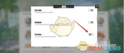 4、最后找到药剂满仓通知,滑动开关开启即可完成设置;