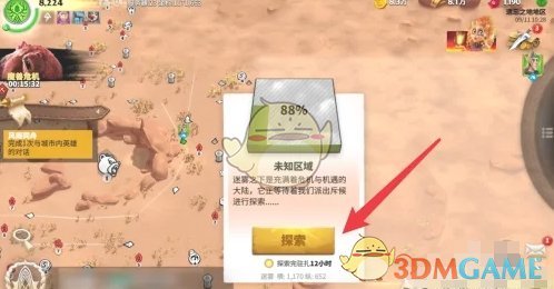 2、接着长按未知区域,点击探索,查看探索所需时间;