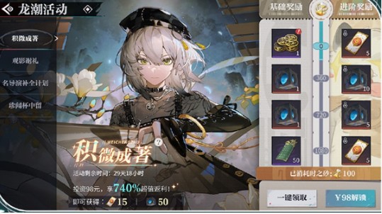 1、活动期间,消耗时之砂即可获得无量幻方、时砂之盒、养成材料等道具奖励,解锁进阶奖励还可累积获得启瞳符*15、无量幻方*50。