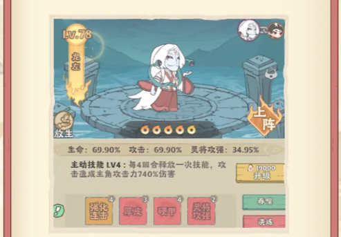 参战技能:间隔4回合释放1次技能,攻击造成主角攻击力740%伤害。