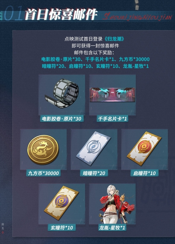登陆即可获得:电影胶卷·原片*30、千手名片卡*1、九方币*30000、暗瞳符*20、启瞳符*10、玄瞳符*10、龙胤-星枚*1