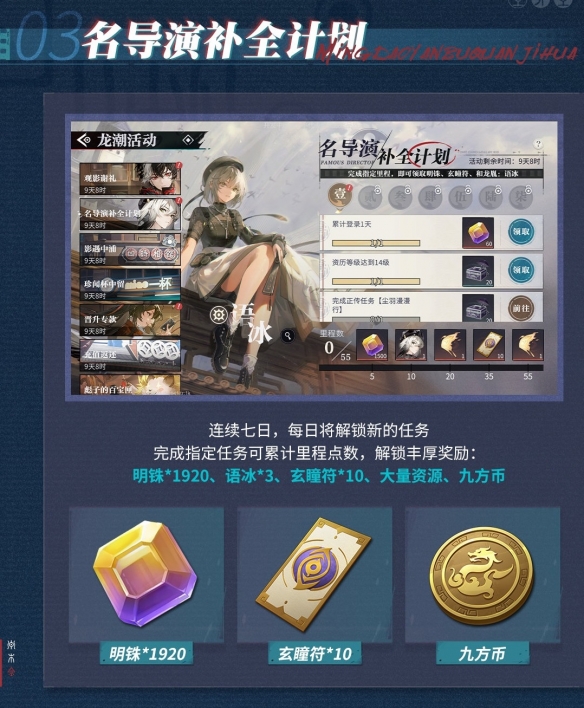 完成指定任务可累计里程点数,解锁丰厚奖励:明铢*1920、语冰*3、玄瞳符*10、大量资源、九方币