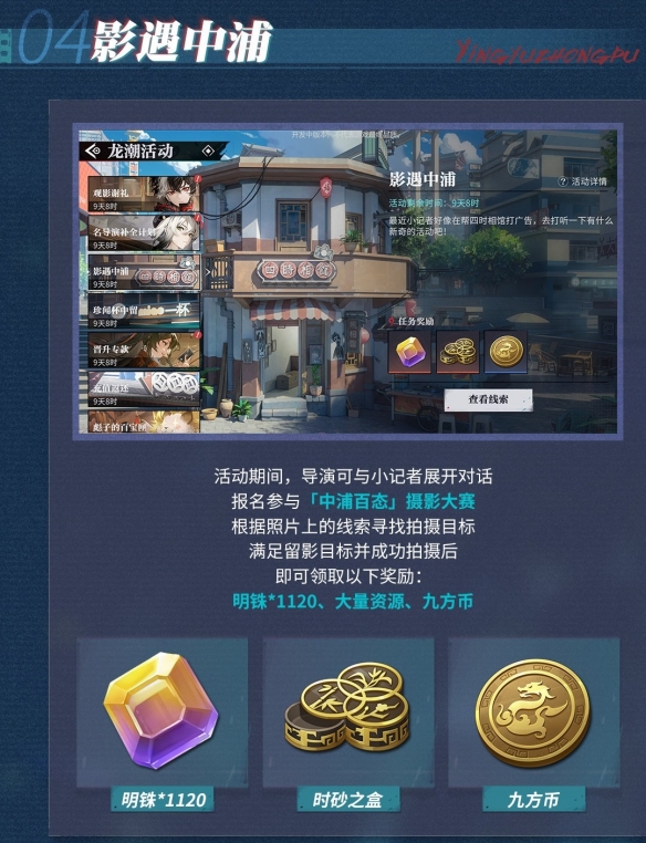 活动期间,导演可与小记者展开对话,报名参与 【中浦百态]】摄影大赛,根据照片上的线索寻找拍摄目标,满足留影目标并成功拍摄后即可领取以下奖励:明铢*1120、大量资源、九方币